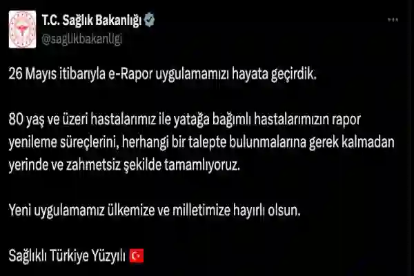“26 Mayıs itibarıyla e-Rapor uygulamamızı hayata geçirdik. 80 yaş ve üzeri hastalarımız ile yatağa bağımlı hastalarımızın rapor yenileme süreçlerini, herhangi bir talepte bulunmalarına gerek kalmadan yerinde ve zahmetsiz şekilde tamamlıyoruz. Yeni uygulamamız ülkemize ve milletimize hayırlı olsun. Sağlıklı Türkiye Yüzyılı.”