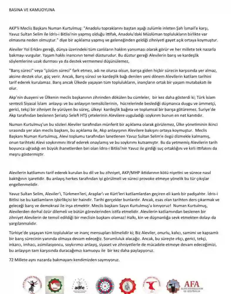 Kurtulmuş’un sözlerinin “Alevi soykırımını onaylamak” anlamına geldiği belirtilen açıklamada, Meclis Başkanı’nın Alevilerden özür dilemesi ve tüm görevlerinden istifa etmesi çağrısı yapıldı.