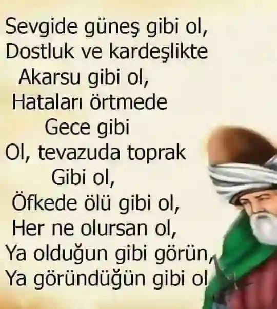 Mevlana’nın aramızdan ayrılışının 750. Yıldönümü 2023 yılı Aralık ayında kendisini anmak ve öğretilerini hatırlamak için yapılan bir anma törenine katıldım. Burada Mevlana’nın aşağıdaki günümüz Türkçesi ile aktarılmış beytini tekrar okumam bana hayatımızı mutlu yaşamak için çok hayırlı tavsiyeler sundu.