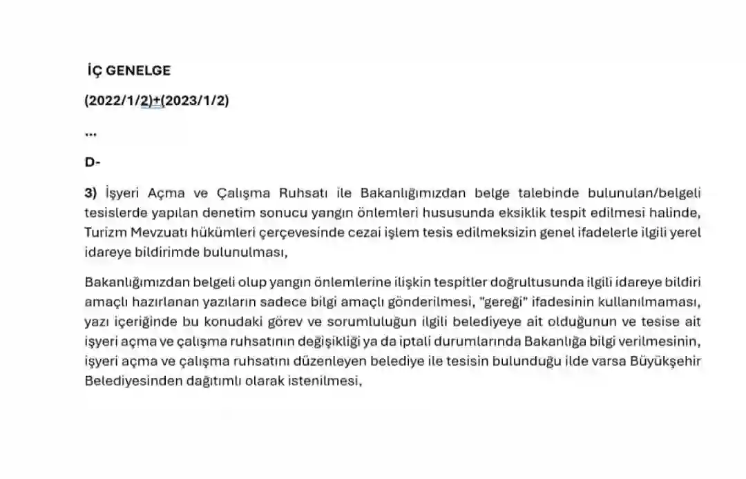 Denetim sorumluluğuna ve itfaiye raporunun bildirilmesine yönelik tartışmalar sürerken, Kültür ve Turizm Bakanlığı’nın turizm işletme belgesi olan tesislerde yangın önlemlerine ilişkin tespitlerin bildirilmesine yönelik Birleştirilmiş İç Genelge’deki kritik bir maddeyi yürürlükten kaldırdığı anlaşıldı.
