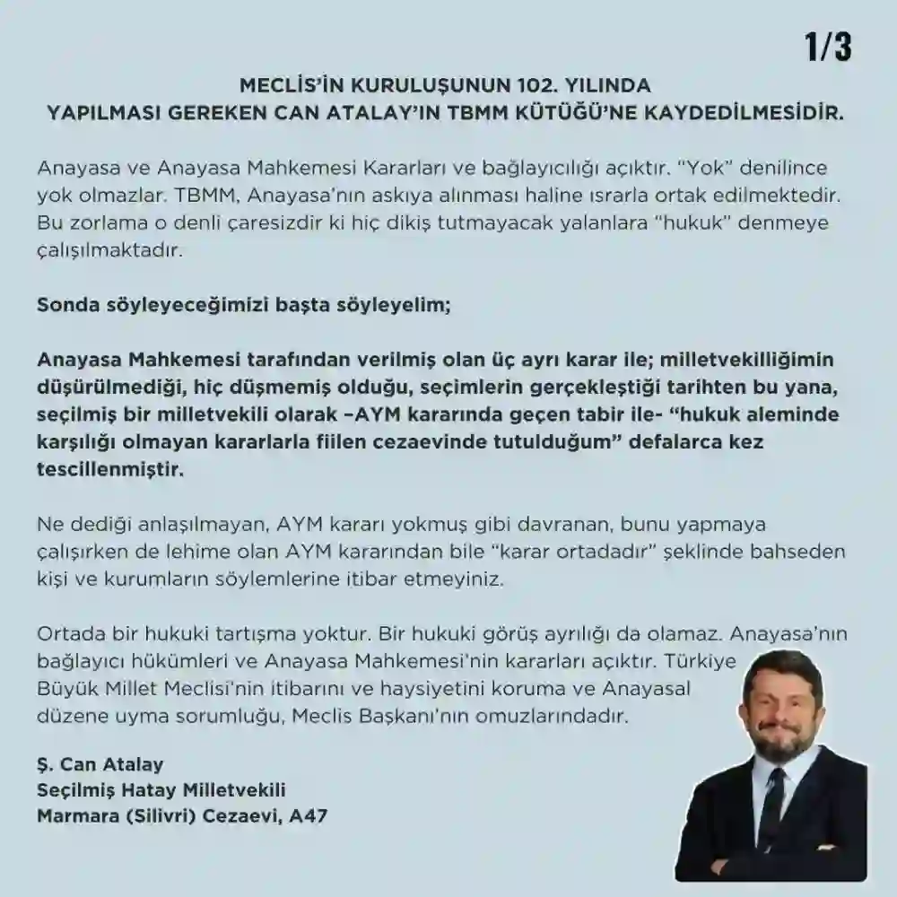 Türkiye Büyük Millet Meclisi’nin (TBMM) 102. kuruluş yıldönümünde, tutuklu milletvekili Can Atalay’dan dikkat çeken bir açıklama geldi.
