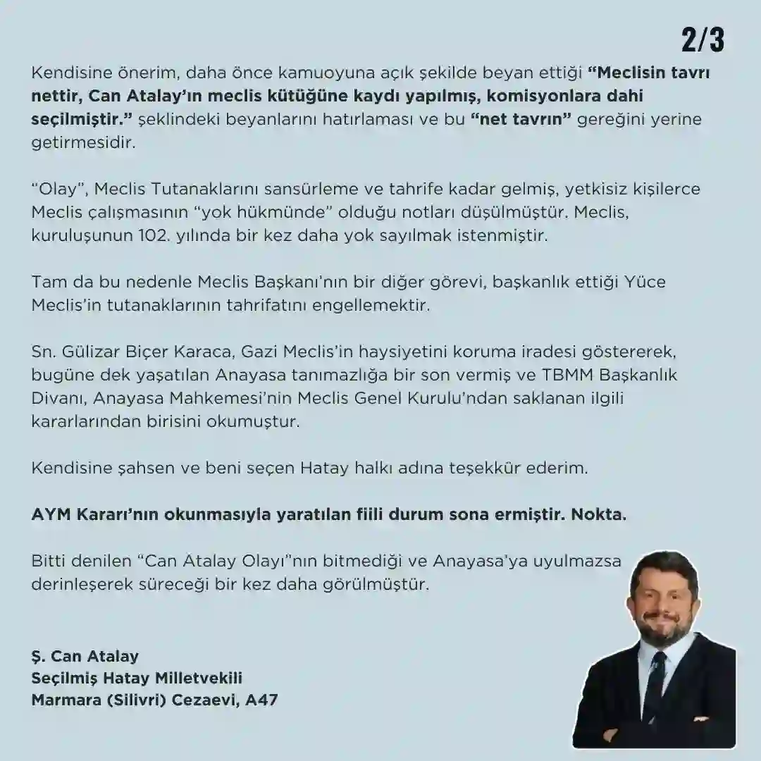 Kendisine önerim, daha önce kamuoyuna açık şekilde beyan ettiği “Meclisin tavrı nettir, Can Atalay’ın meclis kütüğüne kaydı yapılmış, komisyonlara dahi seçilmiştir.” şeklindeki beyanlarını hatırlaması ve bu “net tavrın” gereğini yerine getirmesidir.