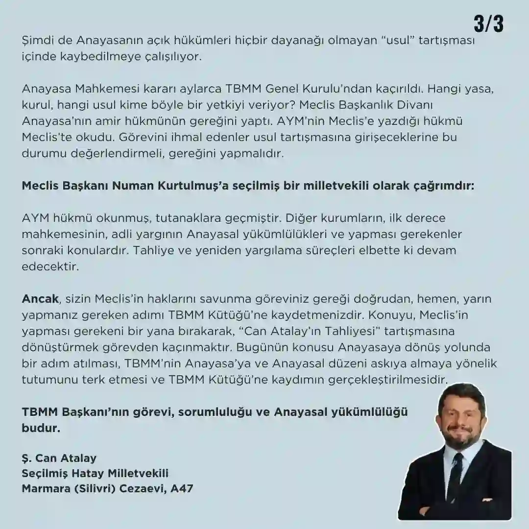 Milletvekilliği düşürülen Gezi davası hükümlüsü Can Atalay, AYM kararlarına rağmen cezaevinde tutulduğunu hatırlatarak “Anayasa’ya uyun, beni Meclis kütüğüne kaydedin!” TBMM Başkanı Numan Kurtulmuş‘a seslendi.