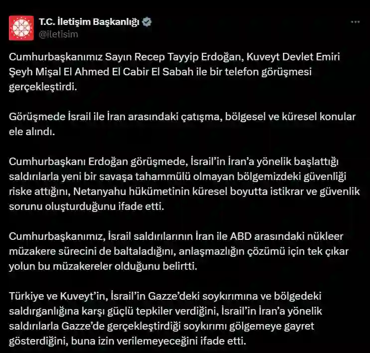 Görüşmede, Türkiye ve Kuveyt’in İsrail’in Gazze’deki saldırılarına ve bölgedeki genel saldırganlığa karşı güçlü tepkiler verdiğine dikkat çeken Cumhurbaşkanı Erdoğan, İsrail’in İran’a yönelik saldırılarla Gazze’deki “soykırımı gölgelemeye çalıştığını” ve buna asla izin verilemeyeceğini söyledi.