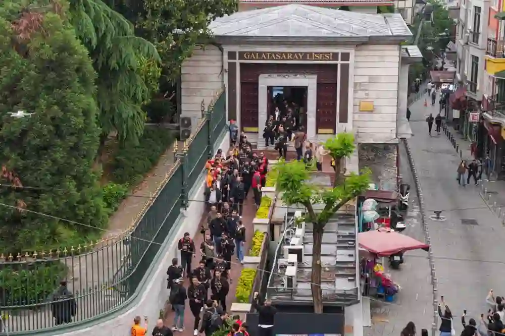 Sarı kırmızılılar, çifte kupanın kutlamalarına Galatasaray Lisesi’nde başladı.
