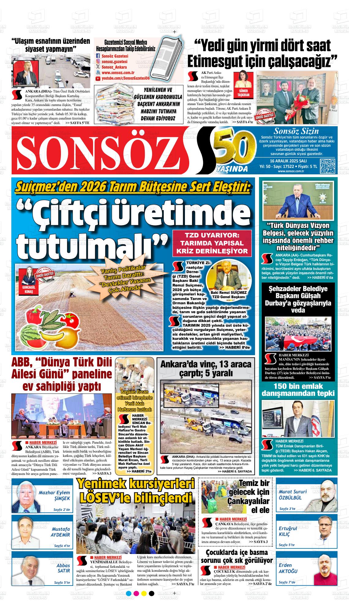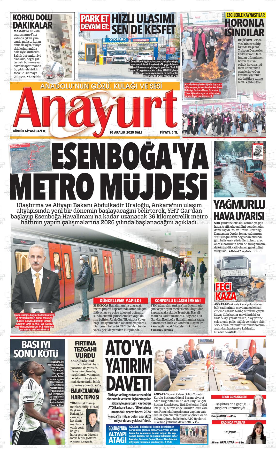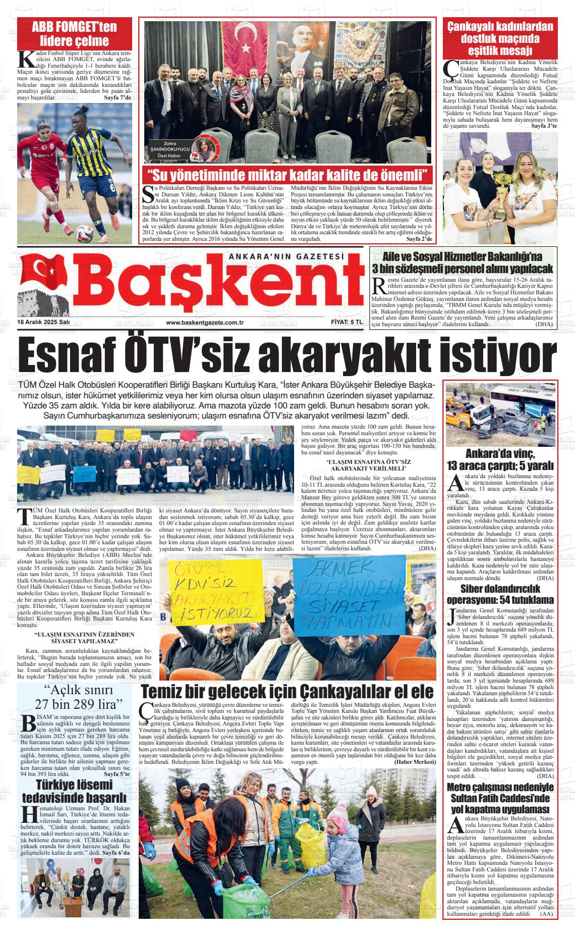 Ankara Yerel Gazeteleri 16 Aralık 2025, Salı Günü Manşeti