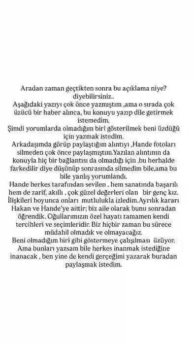 Arkadaşımla görüp paylaştığım alıntıyı, Hande fotoğrafları silmeden çok önce paylaşmıştım. Yazılan alıntının da konuyla hiç bir bağlantısı olmadığı için, bu herhalde fark edilir diye düşünüp sonrasında silmedim bile, ama bu bile yanlış yorumlandı. Hande herkes tarafından sevilen, hem sanatında başarılı hem de zarif, akıllı, çok güzel değerleri olan bir genç kız. İlişkileri boyunca onları mutlulukla izledim. Ayrılık kararı Hakan ve Hande’ye aittir; biz aile olarak bunu sonradan öğrendik.”