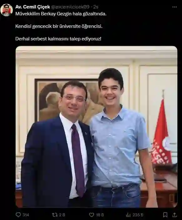 “Müvekkilim Berkay Gezgin hala gözaltında. Kendisi gencecik bir üniversite öğrencisi. Derhal serbest kalmasını talep ediyoruz!”