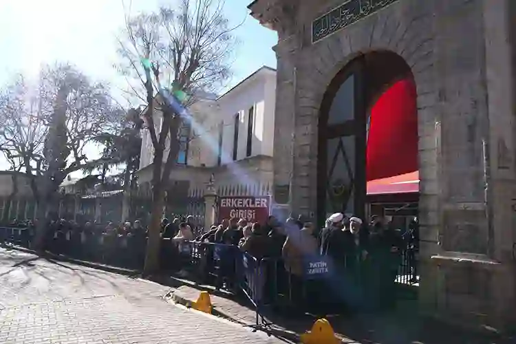 Hırka-i Şerif’i görmek için cami bahçesinde vatandaşlar uzun kuyruklar oluşturdu. Ziyaret sırasında bazı vatandaşlar duygusal anlar yaşadı.