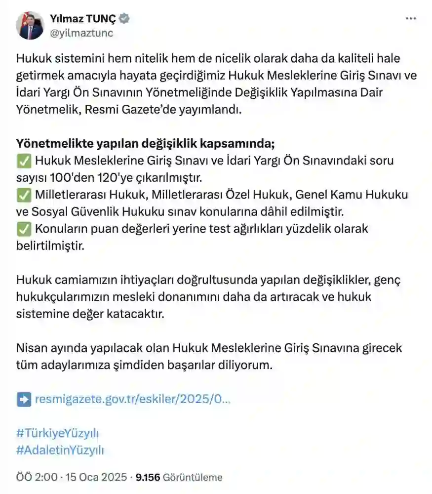 Adalet Bakanı Yılmaz Tunç sosyal medya hesabından paylaşım yaparak değişiklikler hakkında bilgi verdi. Tunç, paylaşımında, “Hukuk sistemini hem nitelik hem de nicelik olarak daha da kaliteli hale getirmek amacıyla hayata geçirdiğimiz Hukuk Mesleklerine Giriş Sınavı ve İdari Yargı Ön Sınavının Yönetmeliğinde Değişiklik Yapılmasına Dair Yönetmelik, Resmi Gazete’de yayımlandı. Yönetmelikte yapılan değişiklik kapsamında; Hukuk Mesleklerine Giriş Sınavı ve İdari Yargı Ön Sınavındaki soru sayısı 100’den 120’ye çıkarılmıştır. Milletlerarası Hukuk, Milletlerarası Özel Hukuk, Genel Kamu Hukuku ve Sosyal Güvenlik Hukuku sınav konularına dahil edilmiştir. Konuların puan değerleri yerine test ağırlıkları yüzdelik olarak belirtilmiştir. Hukuk camiamızın ihtiyaçları doğrultusunda yapılan değişiklikler, genç hukukçularımızın mesleki donanımını daha da artıracak ve hukuk sistemine değer katacaktır. Nisan ayında yapılacak olan Hukuk Mesleklerine Giriş Sınavına girecek tüm adaylarımıza şimdiden başarılar diliyorum” ifadelerini kullandı.