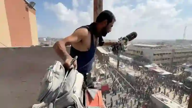 Reuters, haber ajansı için çalışan Filistinli kameraman Hüsam el-Masri’nin saldırıda öldürüldüğünü duyurdu. Görüntüde Filistinli bir adam Masri’nin kullandığı ekipmanı tutuyor, fotoğrafı çeken Hatem Khaled de saldırıda yaralandı. 25 Ağustos 2025.