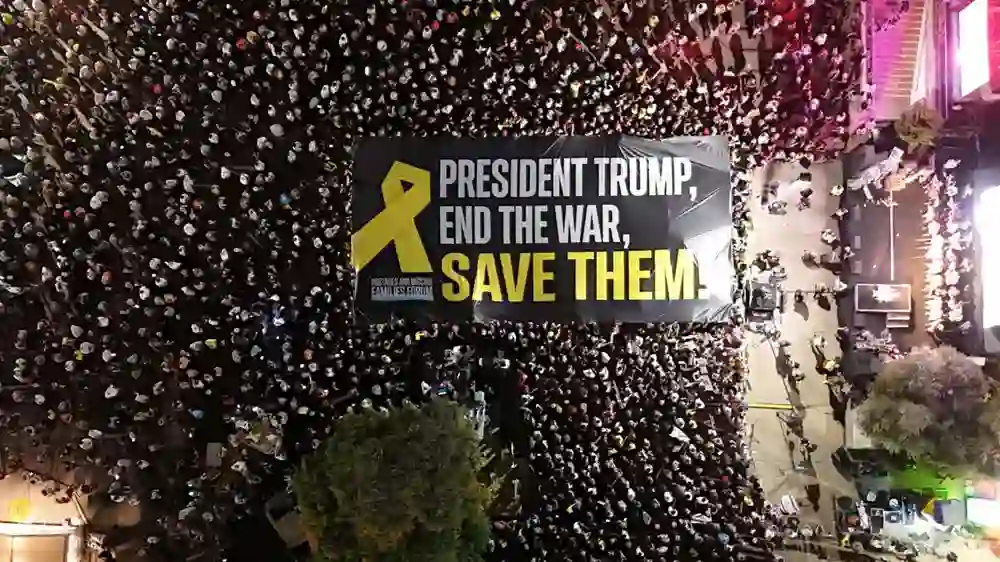 Göstericiler, üzerinde “Başkan Trump, savaşı bitir ve rehinleri kurtar” yazılı dev bir pankart açtı.