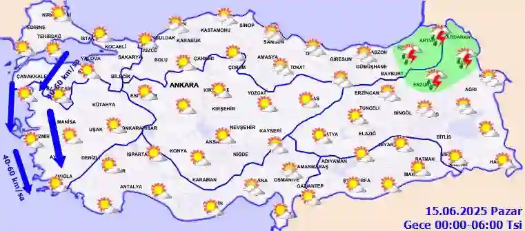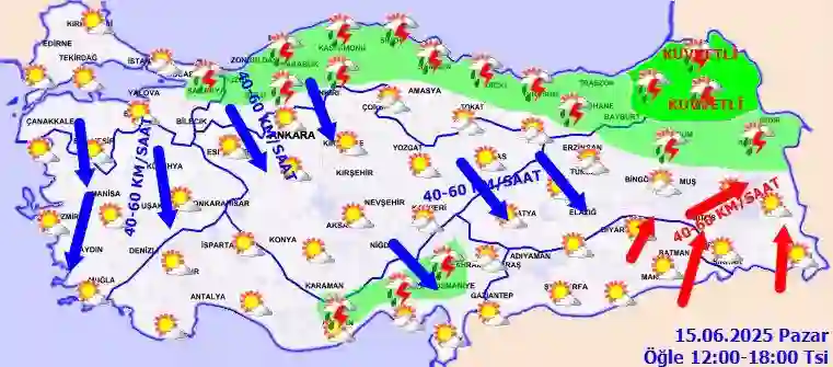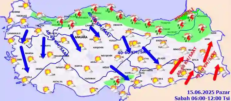 Rüzgarın Marmara’nın güneyi, Ege, Doğu Akdeniz, İç Anadolu’nun kuzeyi ve Doğu Anadolu’nun batısında kuzeyli, Doğu Anadolu’nun güneydoğusu ile Güneydoğu Anadolu’nun doğusunda güney ve güneybatı yönlerden kuvvetli (40-60 km/sa) olarak esmesi bekleniyor.