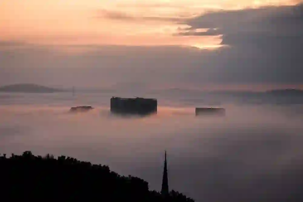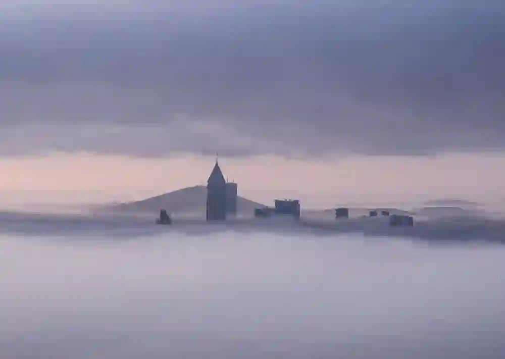 Kentte etkili olan sis nedeniyle yüksek katlı binaların üst kısımları görünmez hale geldi.