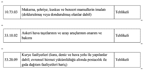 Kurye faaliyetleri (kara, deniz ve hava yolu ile yapılanlar dahil; evrensel hizmet yükümlülüğü altında postacılık ile gıda dağıtım faaliyetleri hariç), “tehlikeli” sınıfa dahil edildi.