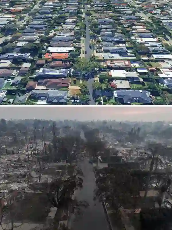 ABD’nin California eyaletinin Los Angeles kentinde şiddetli rüzgarın etkisiyle yayılan orman yangınından sonra çekilen fotoğraflar ile geçmiş dönemdeki uydu görsellerinin karşılaştırması yangının etkilerinin boyutunu gözler önüne serdi.