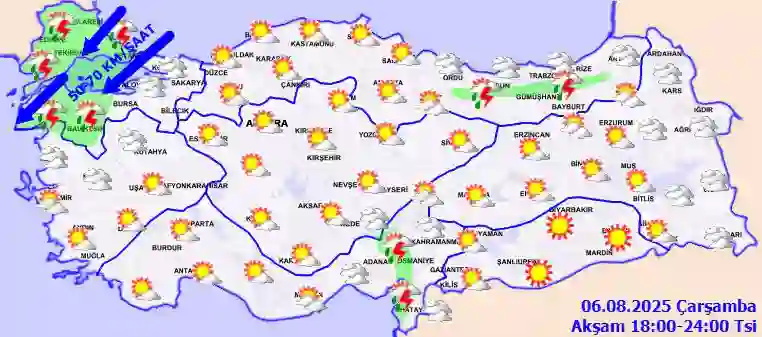 Yapılan tahminlere göre; yurdun kuzeydoğu ve iç kesimleri ile zamanla kuzeybatısının parçalı, yer yer çok bulutlu, İstanbul, Tekirdağ, Edirne, Kırklareli, Balıkesir, Çanakkale, Bursa, Sakarya, Kocaeli, Yalova, Manisa, Rize, Ordu, Giresun çevreleri, Hatay, Adana ve Artvin’in kıyı, Trabzon’un iç kesimleri, Kahramanmaraş ve Osmaniye’nin batısı ile Doğu Akdeniz’in Toroslar kesiminin yerel olmak üzere sağanak ve gök gürültülü sağanak yağışlı, diğer yerlerin az bulutlu ve açık geçeceği tahmin ediliyor.