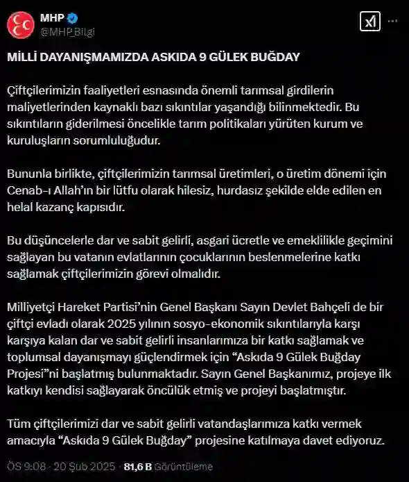 MHP, sıkıntıların yaşandığının farkındayız diyerek “Askıda 9 Gülek Buğday Projesi”ni başlatığını duyurdu. Yapılan açıklamada, “Sayın Devlet Bahçeli de bir çiftçi evladı olarak 2025 yılının sosyo-ekonomik sıkıntılarıyla karşı karşıya kalan dar ve sabit gelirli insanlarımıza bir katkı sağlamak ve toplumsal dayanışmayı güçlendirmek için “Askıda 9 Gülek Buğday Projesi”ni başlatmış bulunmaktadır” ifadelerine yer verildi.