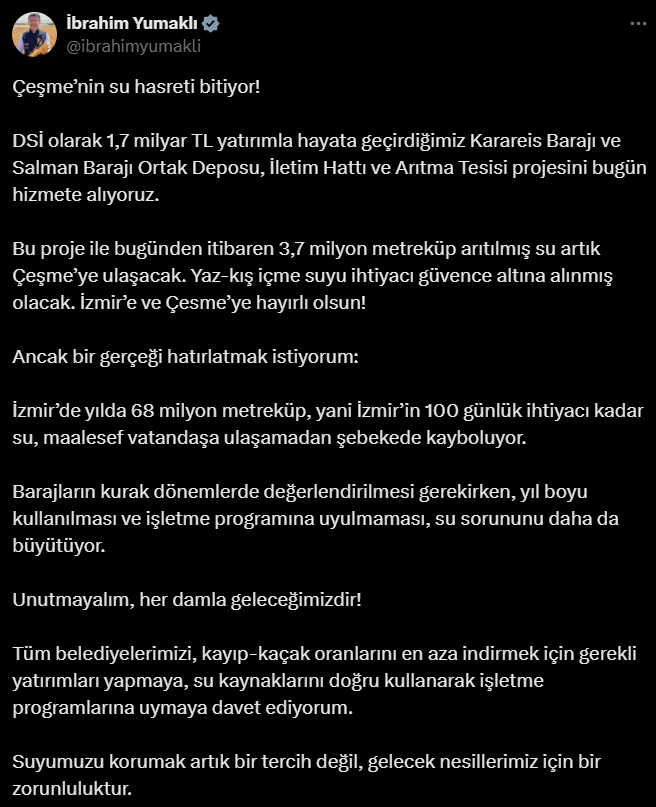 Bu proje ile bugünden itibaren 3,7 milyon metreküp arıtılmış su artık Çeşme’ye ulaşacak. Yaz-kış içme suyu ihtiyacı güvence altına alınmış olacak. İzmir’e ve Çesme’ye hayırlı olsun!
