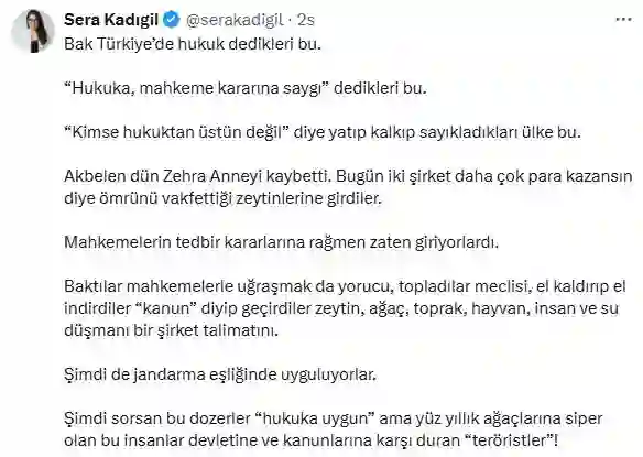 TİP Sözcüsü Sera Kadigil, Akbelen’de maden için istimlak edilen alandaki zeytin ağaçlarının kesilmesine karşı mücadelesiyle tanınan ve dün hayatını kaybeden Zehra Yıldırım’ı andığı paylaşımda “‘Kanun’ deyip geçirdiler zeytin, ağaç, toprak, hayvan, insan ve su düşmanı bir şirket talimatını. Şimdi de jandarma eşliğinde şirket talimatını uyguluyorlar” ifadelerine yer verdi.