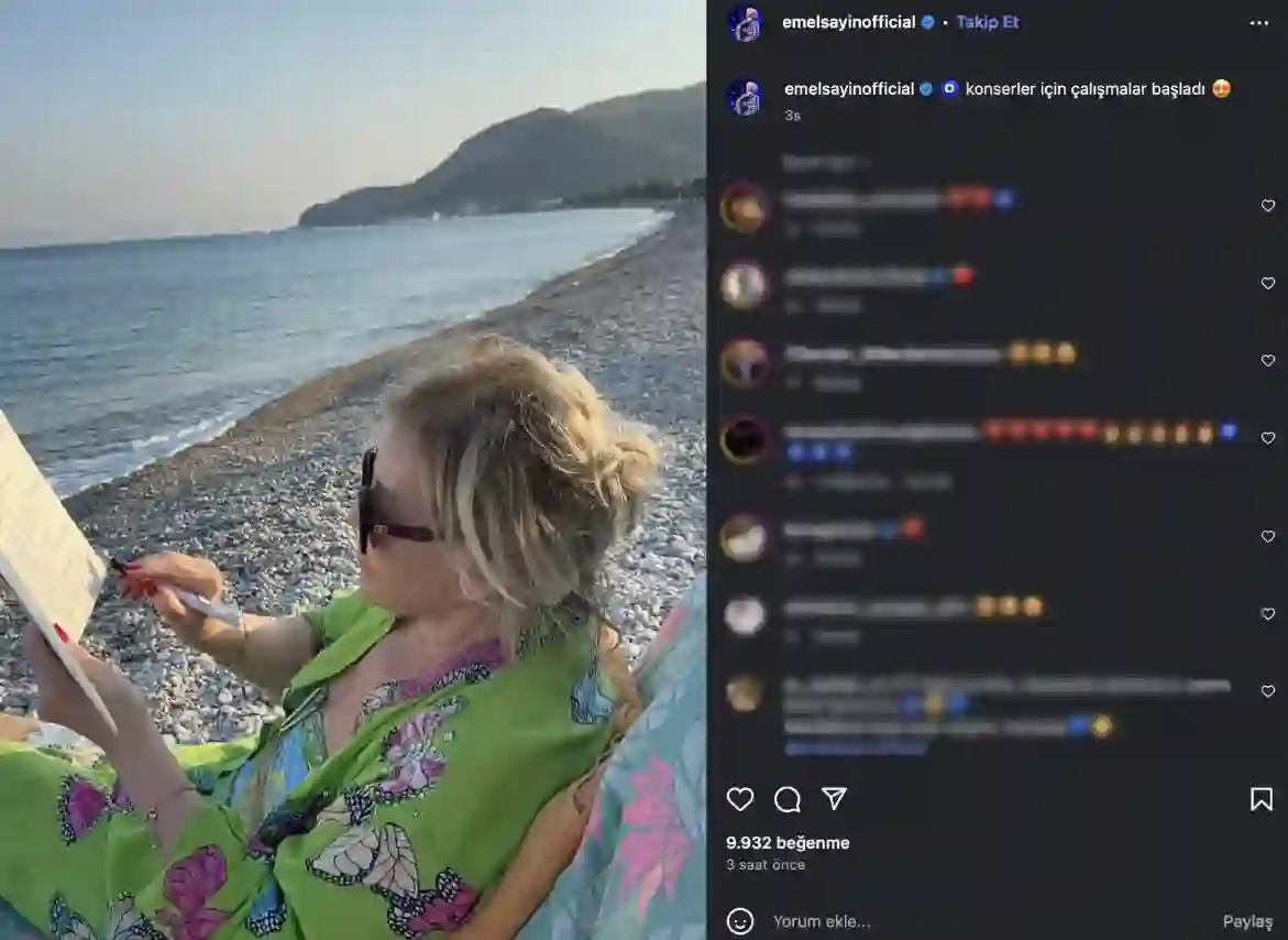 Sanatçı Emel Sayın, sosyal medya hesabından, sahilde kumların üzerinde verdiği bir pozunu paylaştı. Paylaşımına, “Konserler için çalışmalar başladı ” notunu ekledi.