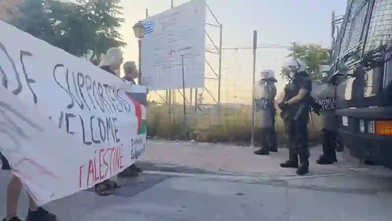 Yunanistan Komünist Partisinin (KKE) üye ve üst düzey yöneticileri, çeşitli sol gruplar, sendikalar ile Filistin yanlısı aktivistlerden oluşan kalabalık, İsrailli gemi yolcularının karaya çıkmasını engellemek amacıyla limanda toplandı.