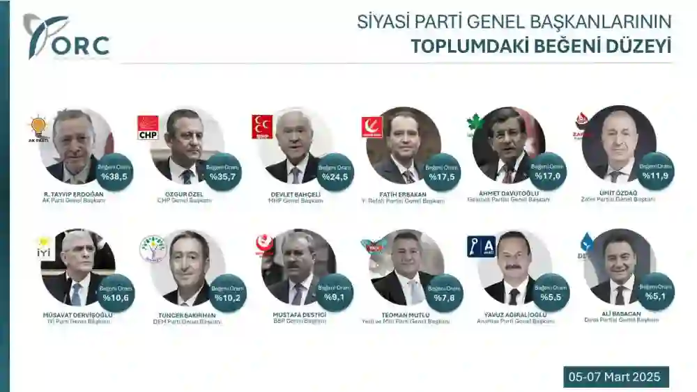 ORC Araştırma, 5-7 Mart 2025 tarihleri arasında gerçekleştirdiği anketle, siyasi parti genel başkanlarının toplumdaki beğeni düzeylerini ölçtü. 26 ilde 3 bin 390 katılımcıyla yapılan çalışmada, katılımcılara her bir genel başkan için ayrı ayrı “Bu genel başkan hakkındaki kanaatiniz nedir?” sorusu yöneltildi.